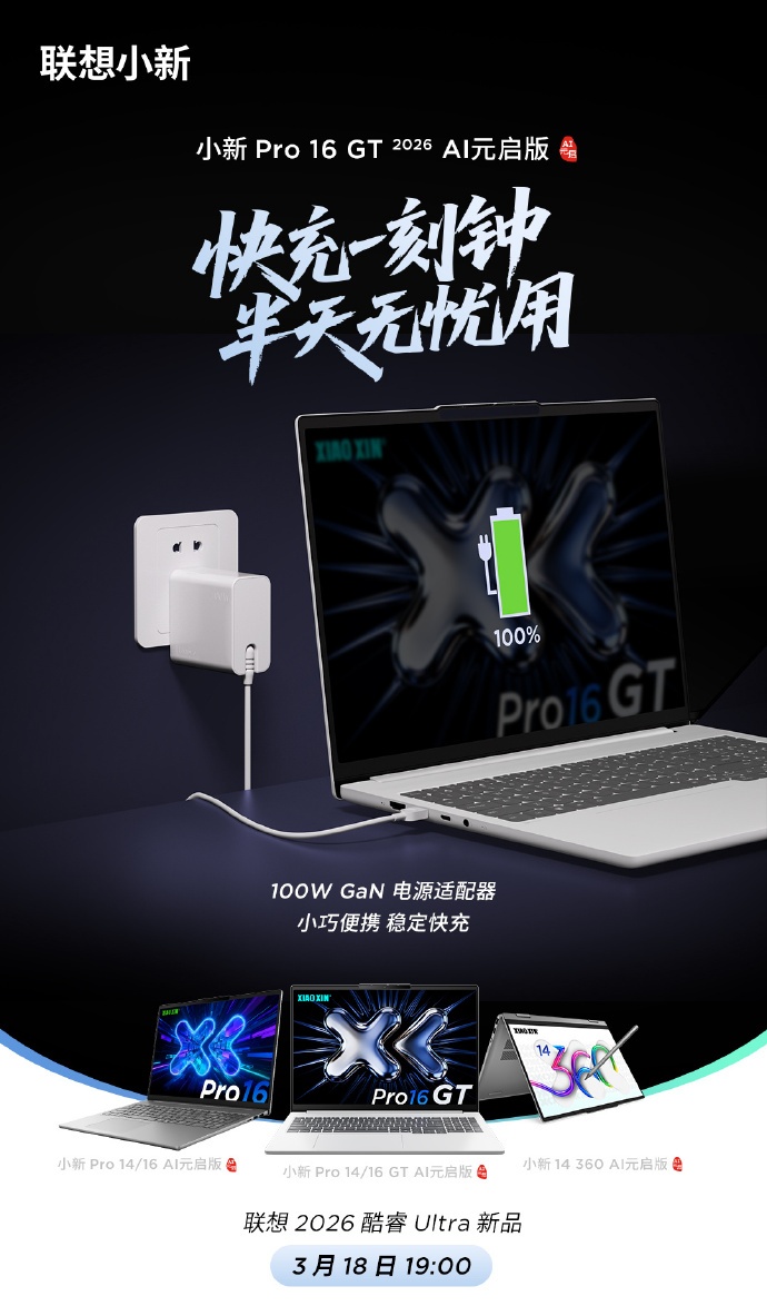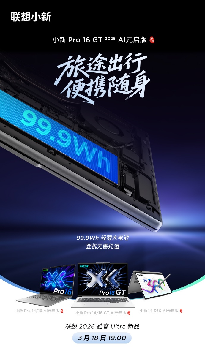 联想小新 Pro 16 GT AI 元启版将在 3 月 18 日晚 19 点整亮相,IT之家将保持关注,第一时间带来最新消息。